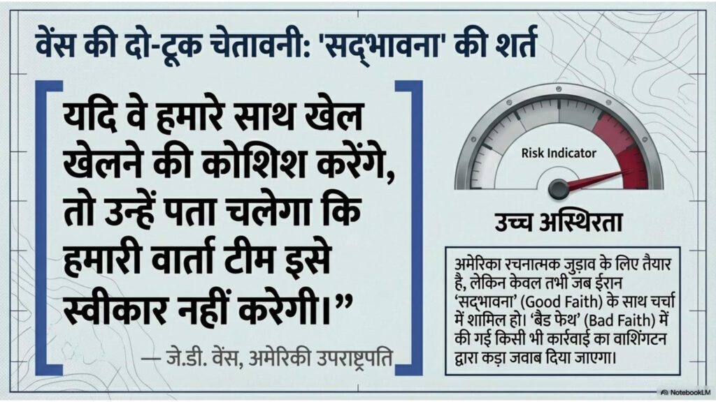 नई दिल्ली। यह स्रोत इस्लामाबाद में होने वाली अमेरिका और ईरान के बीच ऐतिहासिक शांति वार्ता की तैयारियों का विवरण देता है, जहाँ पाकिस्तान एक प्रमुख मध्यस्थ की भूमिका निभा रहा है। अमेरिकी उपराष्ट्रपति जेडी वेंस इस वार्ता के लिए रवाना हो चुके हैं, जहाँ वे राष्ट्रपति डोनाल्ड ट्रंप के प्रतिनिधियों के साथ क्षेत्रीय तनाव को कम करने के लिए चर्चा करेंगे। पाकिस्तान ने सुरक्षा के कड़े प्रबंध किए हैं और विदेशी प्रतिनिधियों व मीडिया के लिए वीजा-ऑन-अराइवल जैसी विशेष सुविधाओं की घोषणा की है। इस कूटनीतिक पहल का मुख्य उद्देश्य दोनों देशों के बीच चल रहे सीजफायर को एक स्थायी शांति समझौते में बदलना है। हालाँकि, इज़राइल और हिज़बुल्ला के बीच जारी हिंसा और परस्पर विरोधी शर्तों के कारण इन वार्ताओं की सफलता को लेकर चुनौतियां बरकरार हैं। जेडी वेंस ने ईरान को ईमानदारी से बातचीत करने की चेतावनी देते हुए स्पष्ट किया है कि अमेरिका केवल सकारात्मक व्यवहार का ही स्वागत करेगा।